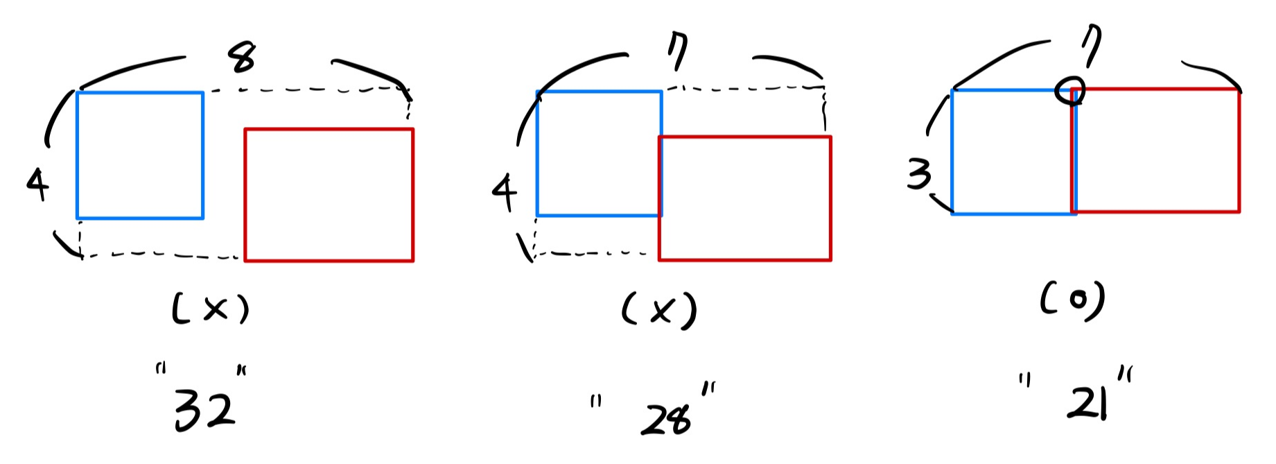모눈종이와 두 스티커 모두 직사각형이고 격자선과 일치하게끔 붙이기 때문에 결국 다음과 같이 생각해낼 수 있었다.