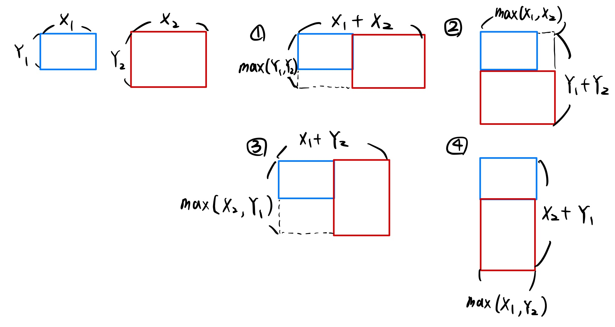 그러면 두 스티커를 붙이는 데 필요한 공간의 크기는 다음과 같이 4가지 경우로 나뉘는 것을 알 수 있다.