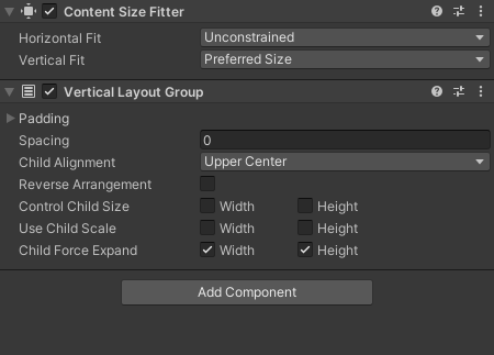 Scrollview/Viewport/Content 게임 오브젝트에 다음과 같이 컴포넌트를 추가해서 content 아래 child에 어떤 text를 입력해도 일정한 간격으로 정렬, 시각화되도록 했습니다.