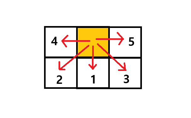 // 차례대로 1. 바로 아래, 2. 아래 왼쪽, 3. 아래 오른쪽, 4. 바로 왼쪽, 5. 바로 오른쪽