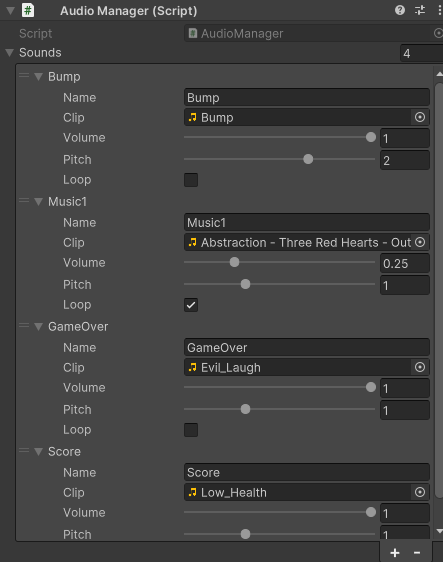 Sound 객체는 이름, AudioClip, 볼륨, pitch, looping 유무, 그리고 AudioSource 값을 가지게 됩니다.