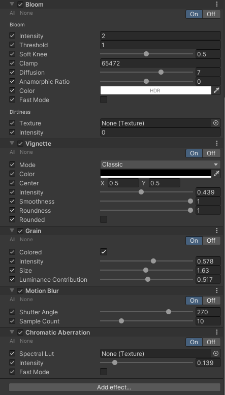 위의 Bloom 효과로 앞서 만든 Material의 emission 부분이 빛나도록 해주었고, Vignette는 화면 가장자리 부분을 어둡게 해주어서 입체감을 높혔습니다. 그리고 Grain 효과로 화면에 잡티가 조금 생기게 해주었고 모션 블러, Chromatic Aberration으로 게임 몰입감을 높혔습니다.