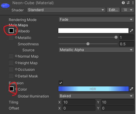 그리고 Material을 유니티에서 새로 생성한 뒤에 그림을 Albedo와 emission Color에 삽입하였습니다.