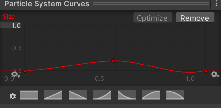그리고 Size over Lifetime을 다음과 같이 설정해서 나타날때 커지다가 다시 사라질때 감소하도록 했습니다.