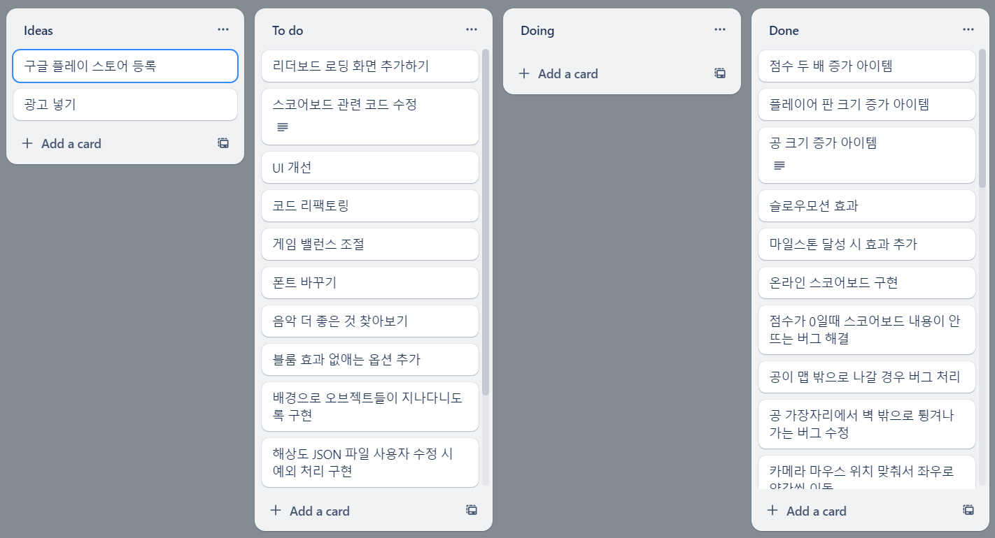 이제는 리더보드, UI, 밸런스, 버그 해결, 효과 추가 등 UX 관련 퀄리티를 높이도록 하겠습니다!